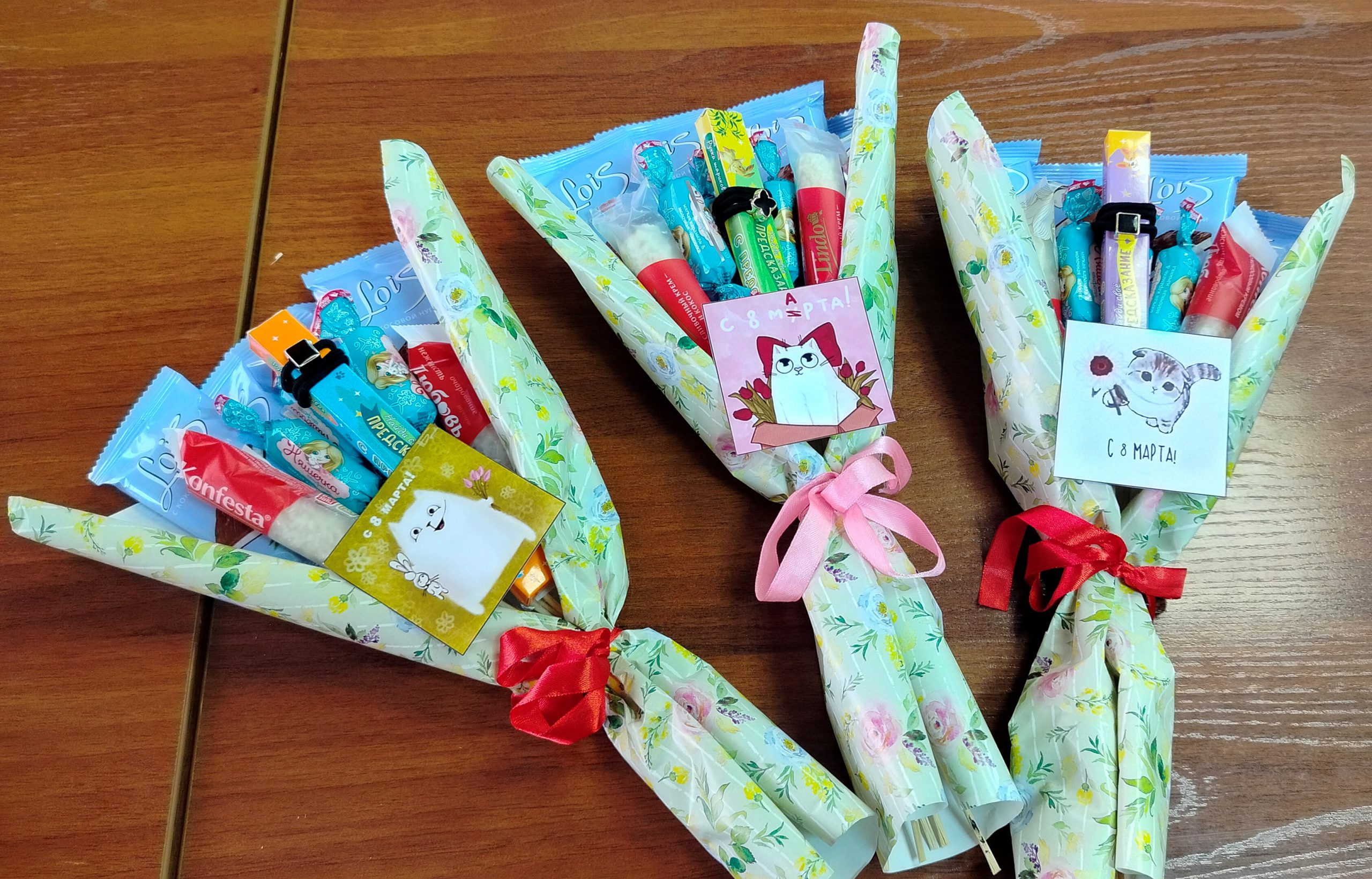 Под руководством опытных мастеров участники шаг за шагом осваивали сборку букетов: подбирали оттенки, комбинировали конфеты и дополняли композиции небольшими сувенирами. Каждый смог почувствовать себя настоящим флористом — только вместо цветов в руках были яркие сладости, а вместо стеблей — изящные шпажки и ленты.